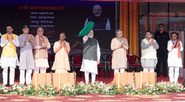प्रधानमंत्री नरेन्द्र मोदी ने बनारस रेलवे स्टेशन, वाराणसी से बनारस-खजुराहो, लखनऊ-सहारनपुर, फिरोजपुर-दिल्ली तथा एरणाकुलम-बेंगलुरु के बीच चलने वाली वंदे भारत एक्सप्रेस ट्रेनों का हरी झण्डी दिखाकर शुभारम्भ किया। कार्यक्रम में उत्तर प्रदेश के मुख्यमंत्री योगी आदित्यनाथ उपस्थित रहे।